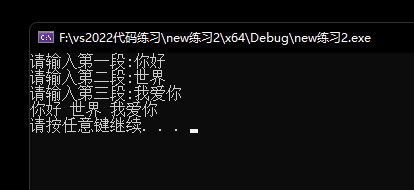 1. 编写一个程序,使用 cin 从标准输入输入 3 段文字,保存到一段动态分配的 内存中,每一段文字输入后,必须要即时保存到动态内存中。 方法(1)注意在使用strcpy的时候vs会报错 <需要在预处理添加:_CRT_SECURE_NO_WARNINGS> #include<iostream> #include<stdio.h> #include<stdlib.h> #include<string> using namespace std; int main(void) { string a, b, c; cout << "请输入第一段:"; cin >&