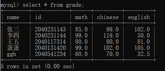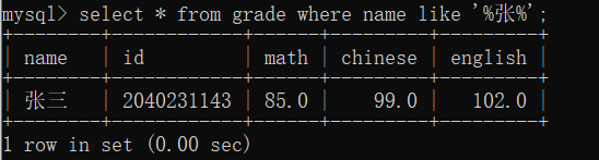 mysql> insert into grade values('张三',2040231143,85,99,102),