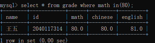 4. IN(option,....),这里是后面给固定的值,判断当前结果中是否有这几个值在其中,比如: where math in(80);