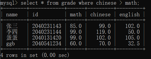 1.>,>=,<,<=,也就是比较,比如上面的成绩中,筛选语文高于数学的: where chinese > math