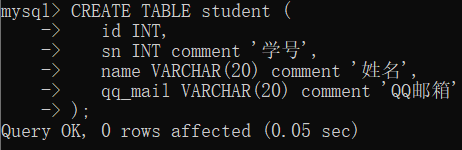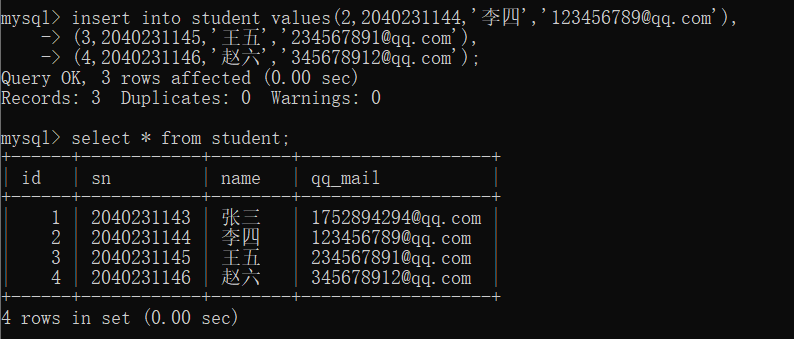 mysql> insert into student values(2,2040231144,'李四','123456789@qq.com'),