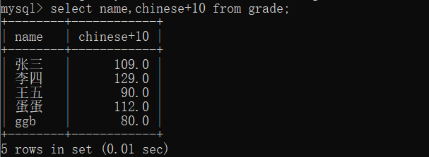 然后我们就可以在查询的时候增加一些运算操作,在这里我们的成绩表中,比如我们想在查询的时候语文成绩的时候加十分,就可以: