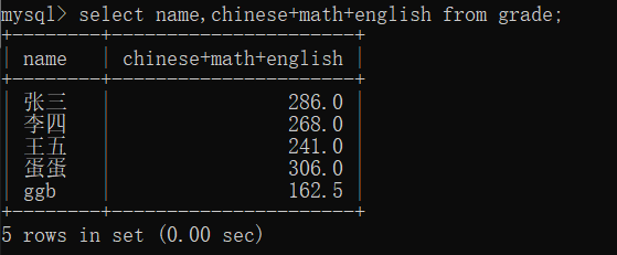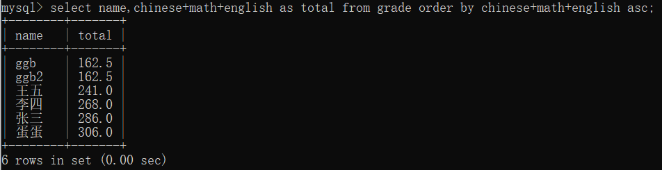 select name,chinese+math+english as total from grade order by chinese+math+english asc//这里用total也可以;