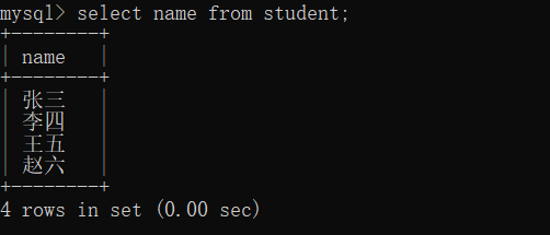 所以除了用select * 查找之外,我们也可以查找其中一个列的数据,比如上面的student表中,我只想知道学生的名字,就可以执行:select name from student;
