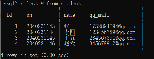 -> (4,2040231146,'赵六','345678912@qq.com');