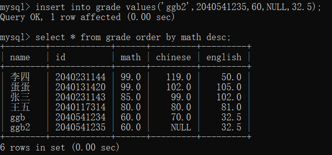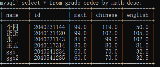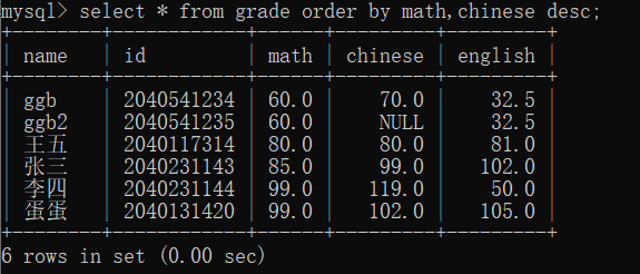 对于这里的排序查询,可以指定更多的数据进行排序,比如select * from grade order by math,chinese desc;他就按照先按数学排序,当数学成绩相等的时候,再比较语文成绩进行排序,我们这里的数学是默认的升序,语文是降序,所以得到的结果是这样的: