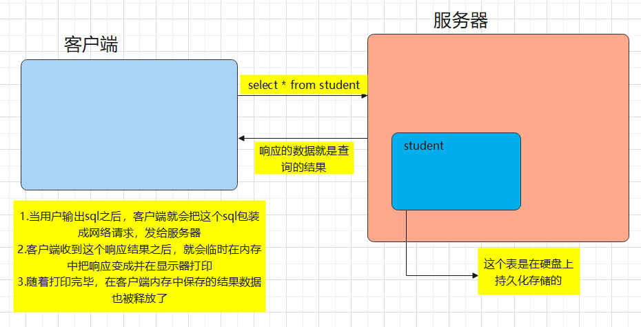 这里就是把一个表所有行和列都查找出来了,然后把查找的结果变成一个"临时表"。❗️ 注意:此处的查询结果临时表,不在硬盘上,而是在内存,随之进行输出之后,数据也会被释放,也就是查完给你看就释放了,不会长久保存。