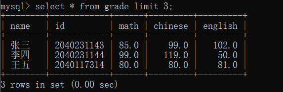 limit查询数据(下面例子查三条)