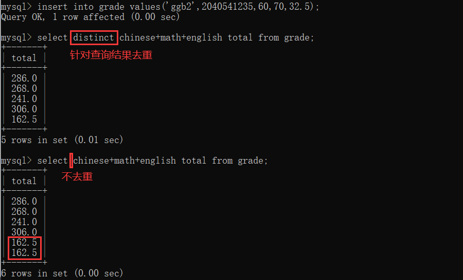 还有一个操作是针对查询结果去重,语法:在需要去重的列名前加distinct