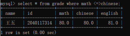 2. =,<=>,这里的=大家比较熟悉,但在这是比较的意思,而我们有一个更好的比较<=>,直接用等号比,万一两边为空它是比较不出来的,而后者可以。比如:where math <=>chinese