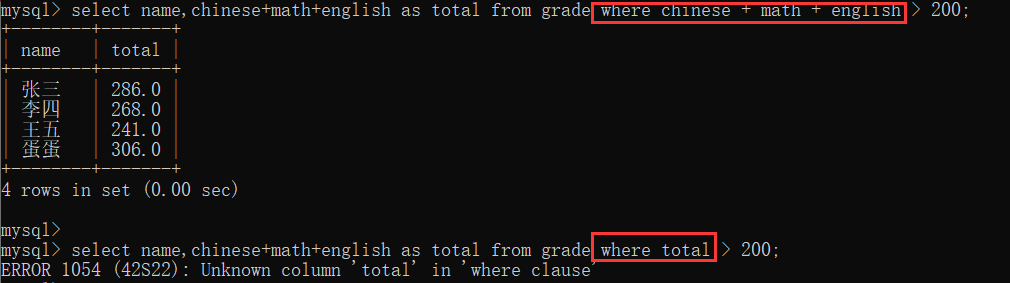 这里就是基本的条件查询了,在这里,我们如果查询结果是三科成绩相加,然后又另命名为total,在条件查询中是不可以用total作为条件列的,也就是where字句不能使用别名,如: