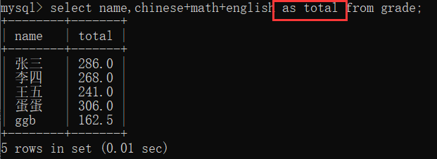 然后我们会发现,总成绩这里的说明那么长一段,能不能给他换个名字呀,这么长太难看了,诶,确实可以换,这时候我们可以查看字段指定别名,语法:在换名的列后面加as 新名字