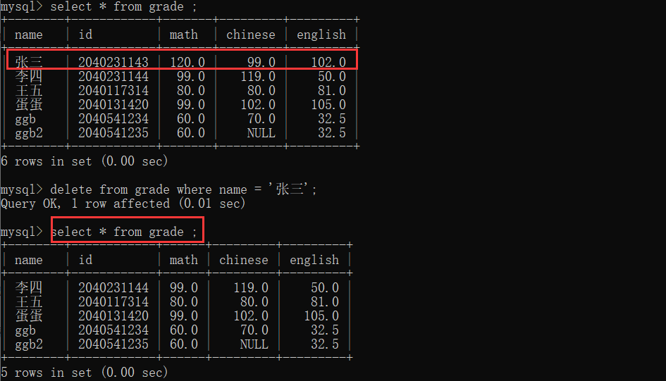 Delect操作也很简单,就是删除数据,这里也要小心,一旦写错就有可能会影响到很多数据,如果我们直接是delete from 表名,没有增加条件的话,就是默认删除所有数据。但是这里和删表不一样,这里表还存在,就是里面的数据没了,但这个表还在。
