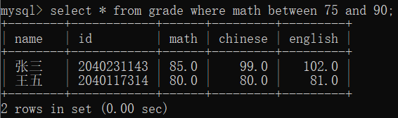 3. between A and B,这里是构造一个闭区间[A,B],在这范围内的数据输出,比如:where math between 75 and 90;