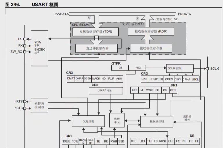 26-串口功能框图 5:包含以下部分一:引脚6:引脚串口引脚:TX;RX;SW_RX(智能卡模式);nRTS;nCTS;(硬件流)SCLK(时钟)7:串口发送,把数据打包成帧;二:数据寄存器8:TDR发送数据寄存器---发送移位寄存器---TX标志位1:Transmit data register empty(发送数据寄存器为空)---把这个中断打开了(这个时候会产生中断 ) 标志位2:发送完成---相应的中断9:读数据只有一个标志位会发生变化...
