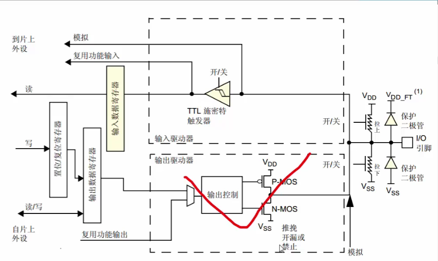 13-GPIO功能框图 今天学习了GPIO的功能框图,总结一下stm32f407 GPIO的功能框图控制GPIO的寄存器有以下几种1:GPIOx_MODER:控制端口输入输出模式2:GPIOx_OTYPER:端口输出类型寄存器,输出开漏3:GPIOx_OSPEEDR4:GPIOx_PUPDR5:GPIOx_IDR6:GPIOx_ODR7:GPIOx_BSSR8:GPIOx_LCKR9:GPIOx_AFRL10:GPIOx_AFRHGPIOx_ODR寄存器,当使用该寄存器配置输出.