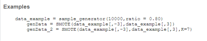 结果恰好发现有一个叫smotefamily的包,于是碰运气下载导入后发现确实可用,但是函数用法又有错误,在help说明中看到了示例,于是对照示例改了自己的代码。