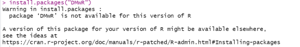 R语言安装DMwR报错解决方法 如果代码是install.packages("DMwR")那可能是安装包的版本问题,改为install.packages("DMwR2")试一下。导入的时候也是library("DMwR2")改错具体过程: 一开始以为是RStudio的版本不够新,更新完Rstudio发现还是不行;又下载了Rtools,还是报错安装DMwR代码如下install.packages("DMwR")报错显示Warning in install.packages :...