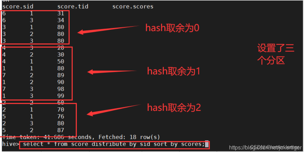 Hive排序 sort by / distribute by / cluster by distribute bysort by(sort by limit n,limit将运行两次,一次reducer内排序limit n,一次从每个reducer里取n条放在一起进行limit)distribute by x 将x按照hash取模分配到不同的reducer里面,sort by y在reducer里面按照y排序如下图,三个框代表3个reducer(distribute by),里面按照scores进行了排序(sort by)(图片有误,应是取模)cluster bycluster