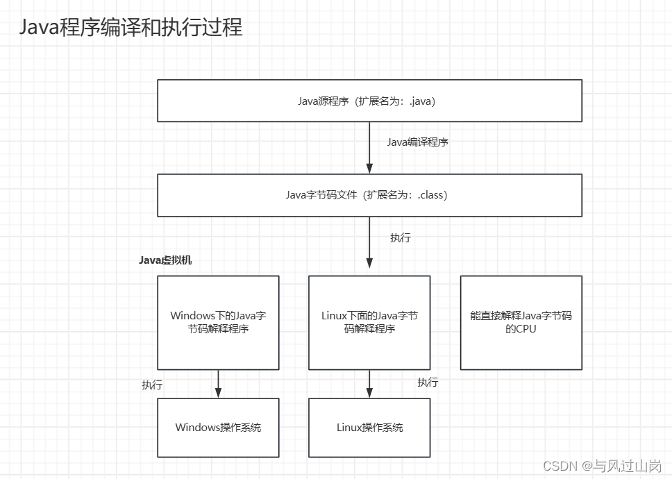 java程序的跨平台主要是指字节码文件可以在任何具有java虚拟机的计算机或者电子 设备上运行,java虚拟机中的java解释器负责将字节码文件解释成为特定的机器码进行运行。