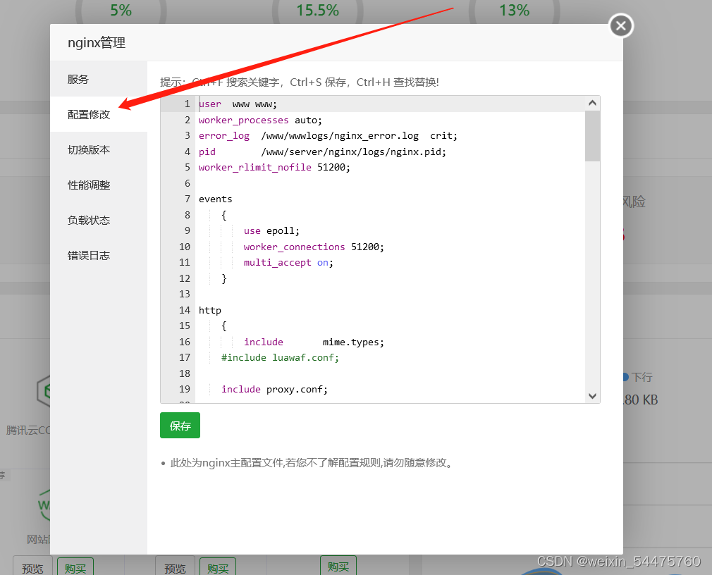 在宝塔面板中打开Nginx管理,打开配置修改。