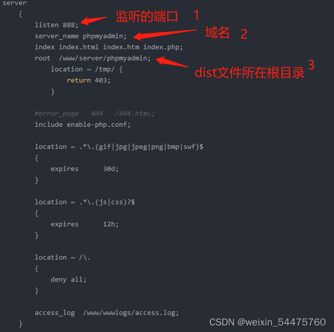 接下来我们做修改:把server和下面大括号里的内容复制一遍,和原来并列,我们要监听自己的前端。