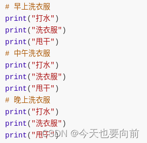 以洗衣服为例,我们可以将洗衣服的过程分为打水、洗衣服、甩干,假如说我们早中晚都要洗衣服,那我们是不在每个阶段都重复同一个过程:打水、洗衣服、甩干