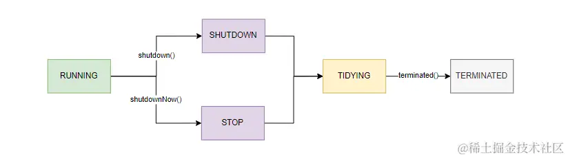 | SHUTDOWN | 关闭状态,无法接受新任务,但可以处理阻塞队列中的任务 |
