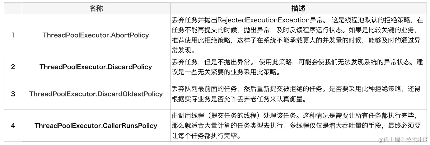 任务拒绝模块是线程池的保护部分,线程池有一个最大的容量,当线程池的任务缓存队列已满,并且线程池中的线程数目达到maximumPoolSize时,就需要拒绝掉该任务,采取任务拒绝策略,保护线程池。