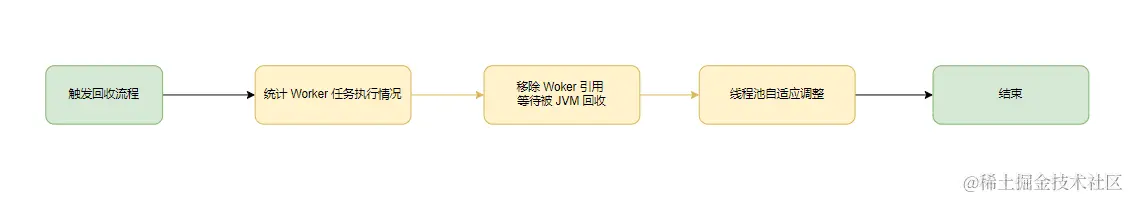 Worker 的回收依赖 JVM 的垃圾回收,线程池根据当前线程池状态维护一定 Worker 的引用,当 Worker 获取不到任务时,则会触发 Worker 回收流程,实际上就是消除 Woker 的引用,等待 JVM 回收。