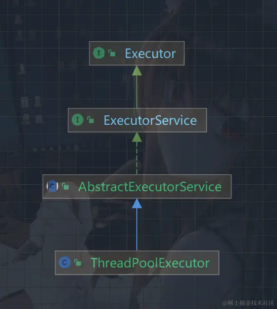 ThreadPoolExecutor实现的顶层接口是Executor,顶层接口Executor提供了一种思想:将任务提交和任务执行进行解耦。用户无需关注如何创建线程,如何调度线程来执行任务,用户只需提供Runnable对象,将任务的运行逻辑提交到执行器(Executor)中,由Executor框架完成线程的调配和任务的执行部分。