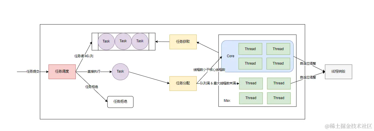 我们先看一下 ThreadPoolExecutor 的整体运行机制,可以发现整体分为任务调度和 Worker 线程管理两大部分: