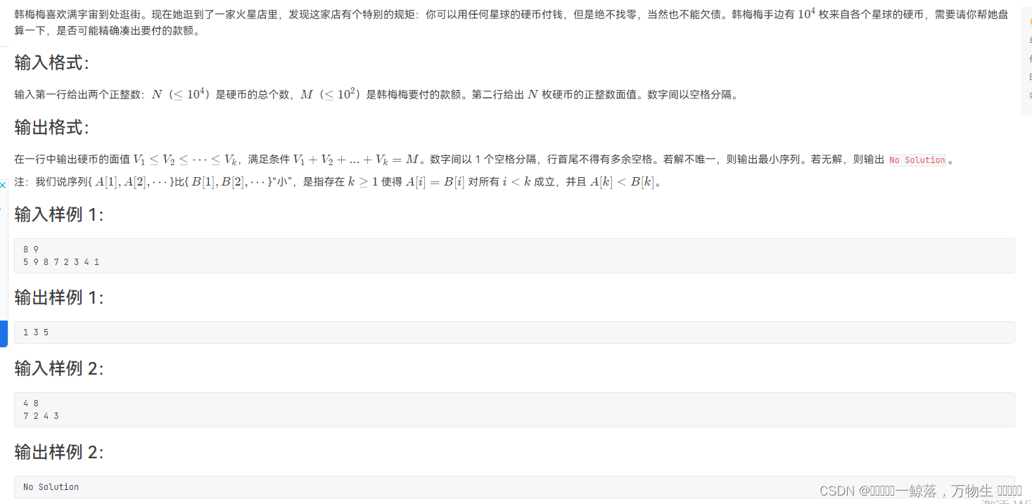 解题思路:本题乍一看好像挺简单,就是个背包问题呗,但是一看要输出字典序最小的路径就懵逼了,所以这个题的难点在于如何记录路径。现在从头开始说,这个题可以看成是一个01背包问题,只不过体积和价值都是m罢了,然后要求输出字典序最小的路径,因为要输出字典序最小的路径,所以我们首先要对输入的序列从大到小进行排序,为啥来?因为当我们在做01背包时,如果在后面出现了合法方案会将前面得到的方案给覆盖掉,所以要把越小的数放在越后面,这样求出来的数就是最小字典序方案了,接下来难点来了,如何记录路径?开一个pre[][]数组,如果说当前我们在第i个物品处对体积为j的dp数组(f数组)做了修改,就将pre[i][j]=1,说明在寻找最优解的过程中来到过这一步,然后倒着找走过的状态,然后输出就行,这里不知道怎么用语言来表达QAQ,还是看代码比较好。