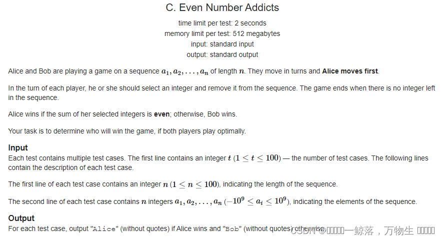 有n个数字,有两个人Alice和Bob,每个人每一轮可以从剩下的数字中选择一个数字,Alice先手,直到所有数字都选完为止,然后统计一下,如果Alice手中的数字之和为偶数那么Alilce赢,否则Bob赢,如果两个人都采取最优策略,问最终谁会取得胜利。