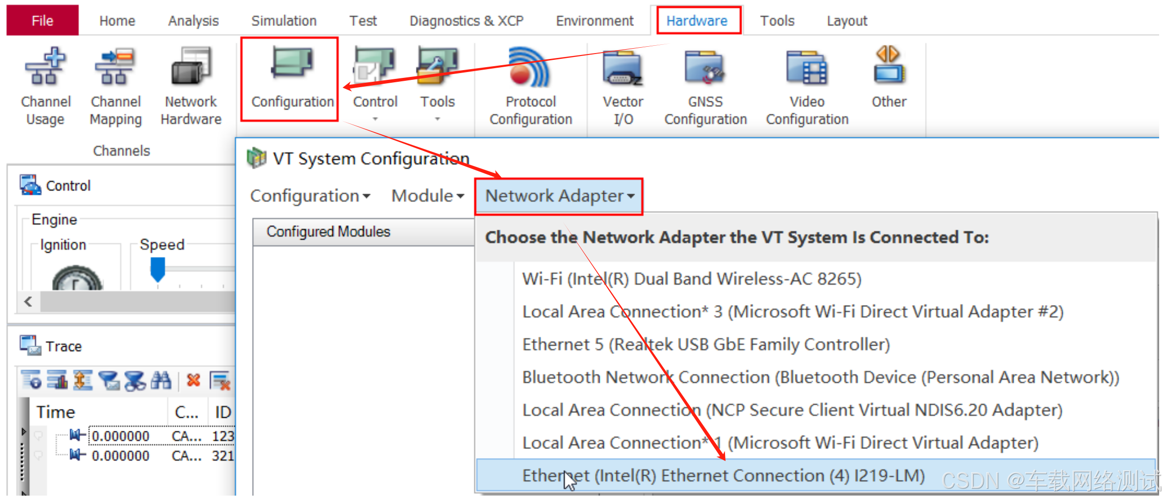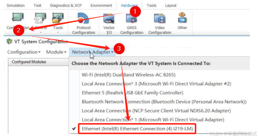 在 CANoe -> Hardware -> VT System Configuration -> Choose Network Adapter,选择连接到 VT System的网卡,如下图所示。