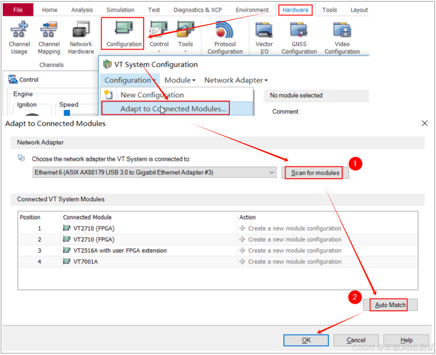 在 CANoe -> Hardware -> VT System Configuration -> Adapt to Connected Modues,扫描到连接的 VT 板 卡后再进行 Auto Match,如下图所示