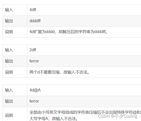 若判断输入为合法的经过压缩后的字符串,则输出压缩前的字符串;若输入不合法,则输出字符串“!error”。