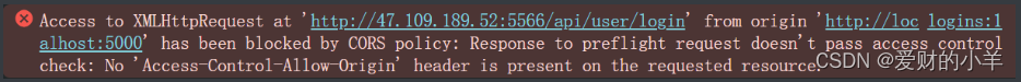 翻译过来,大致意思就是, 源网址http://localhost:5000访问XMLHttpRequest网址 http://47.139.199.52:5066/api/user/login 被同源策略阻止了.