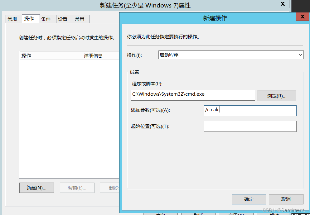 4、新建一个操作,这里以calc为例(实战中可以直接用powershell远程上线C2)