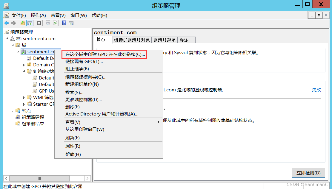 1、在域控主机执行gpmc.msc,在组策略管理中右键创建一个GPO: