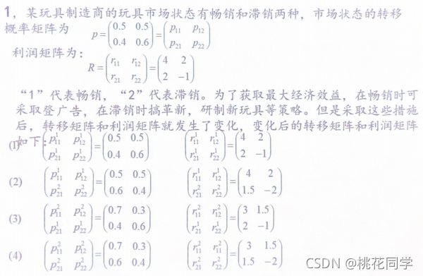 关于马尔科夫链的期望收益在matlab中的实现 关于马尔科夫链的期望收益在matlab中的实现的作业例题如下(from 天津大学 制造系统仿真)这里的R和P方针需要自己新定义变量下面给出matlab代码% P为转移矩阵,R为回报矩阵i=input('状态数');n=input('希望得到几期的收益');vExpect=[];%这里初始化第一行的期望收益for y=1:i vExpect=[vExpect,P(y,:)*(R(y,:))'];end%这里对于接下来的每一期状态进行预测for x=2:n