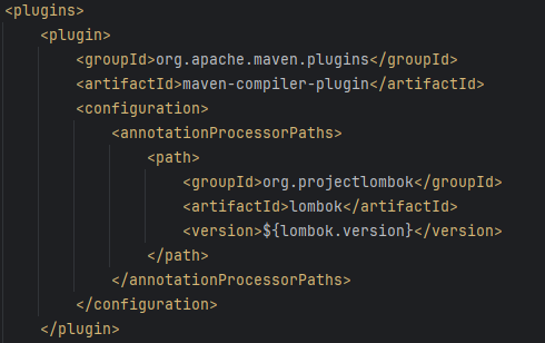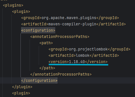 (2)接着将上面找到的lombok的正确版本号在pom.xml文件中配置lombok注解处理器处进行配置