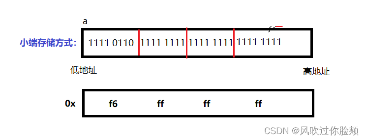 不难看出int a=-10这个例子,-10这个数在计算机内存中存储方式是小端存储,且存储的二进制补码,被以十六进制显示出来,为0xf6 ff ff ff。