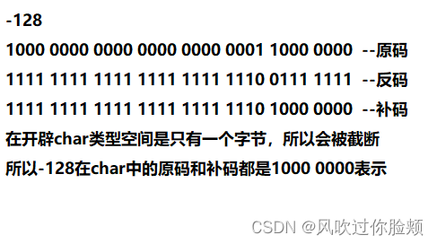 首先我们知道char类型在内存中开辟一个字节,8个bit位的空间,若是unsigned char无符号char类型,它的范围是0~2^8-1(0~255)。若是signed char有符号char类型,第一位则考虑为符号(无非就是0和1)。后面7个bit位置.若是第一个位置是0,则它的范围是0~2^7-1(0~127)。若第一个位置是1,则它的范围是(-127~-0)。但是我们规定这个时候0还是(00000000)表示。而(10000000)则表示为-128。故signed char有符号char类型的范围是-2^7~2^7-1(-128~127)。