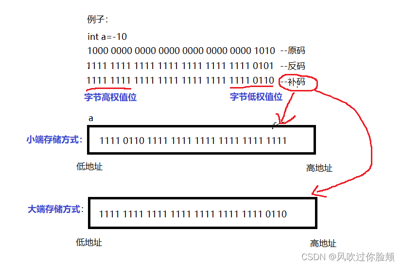 在我们将二进制补码存入内存开辟的空间时,内存中开辟的空间有高低地址之分(例如:int对应四个字节,32个bit位的空间,一端地址是低地址,依次递增,到另一端就是高地址),而我们的数据对于的二进制补码也会有字节的高权值位和低权值位。对于存储的方式就会有: