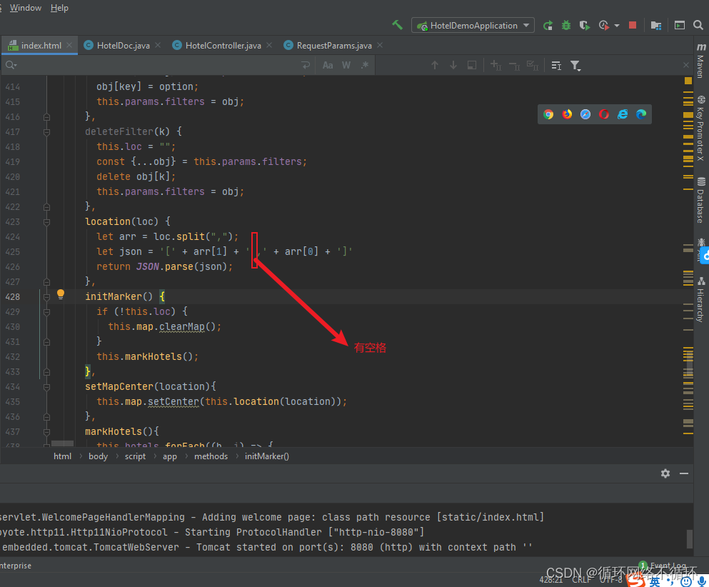 if语句块最终跳转到下面这个方法中,最终发现了问题所在。我在把数据插入ES中的时候location这个属性是不加空格的,而前端在解析json的时候是加空格的,最终导致json无法解析。因此在进行数据插入时要保持数据一致,不然很容易错。找这个错误花了我两个小时的时间,就是为了一个空格。