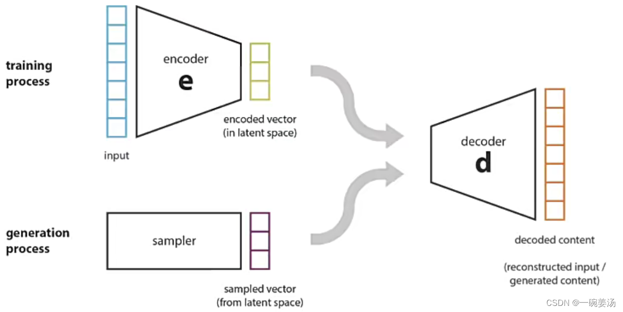 - 自编码器训练,以最小损失为目标,而不管潜空间如何组织。容易导致严重的过拟合问题,很难直接用于内容生成任务。