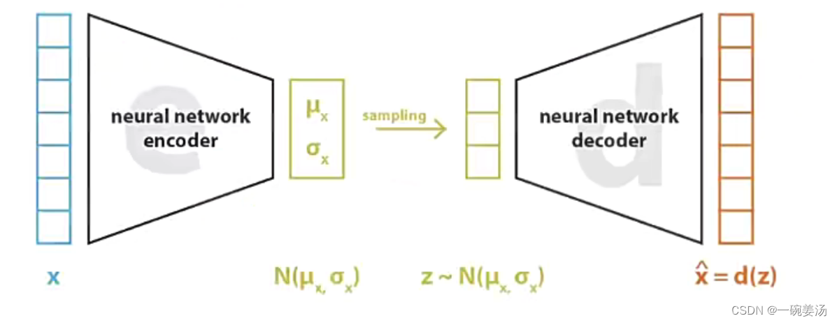 - 因为输入数据在隐空间里对应的特征编码是一个分布,所以可以从分布当中进行采样,然后再生成内容。 这个就是变分自编码器的思想。