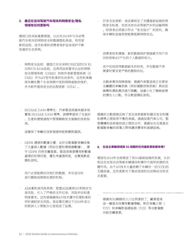 政策完善:修订《机动车管理法》,要求车企建立网络安全管理系统,2025 年推进 L4 级卡车高速测试。